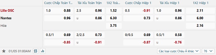 Tip kèo Châu Á hiệp 1 Lille vs Nantes