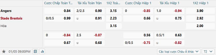 Tip kèo Châu Á hiệp 1 Angers vs Brest