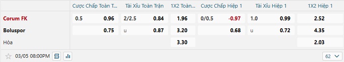 Tip kèo Châu Á hiệp 1 Corum vs Boluspor