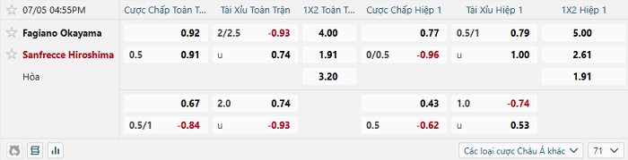 - Dự đoán tỷ số hiệp 1: Fagiano Okayama 0 – 0 Sanfreece Hiroshima