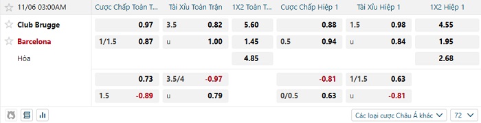 Tip kèo Châu Á full trận Club Brugge vs Barcelona