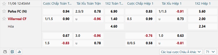 Tip kèo Châu Á hiệp 1 Pafos vs Villarreal