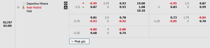 Tip kèo Châu Á full trận Minera vs Real Madrid