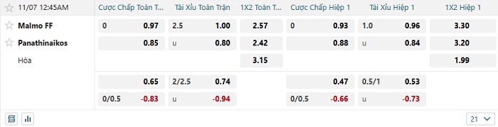 Tip kèo Châu Á full trận Malmo vs Panathinaikos