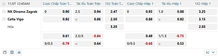 Tip kèo Châu Á hiệp 1 Dinamo Zagreb vs Celta Vigo