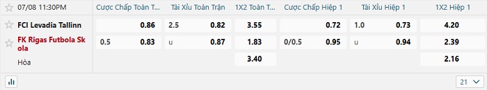 Tip kèo Châu Á full trận Levadia Tallinn vs FK Rigas