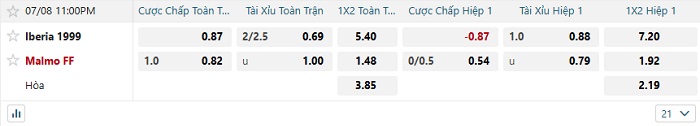 Tip kèo Châu Á hiệp 1 Iberia 1999 vs Malmo