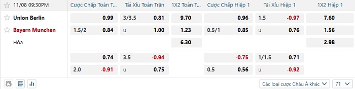 Tip kèo Châu Á hiệp 1 Union Berlin vs Bayern Munich