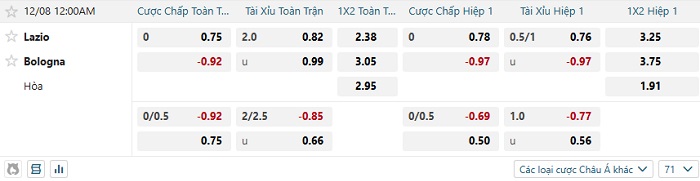 Tip kèo Châu Á full trận Lazio vs Bologna