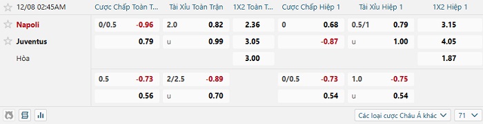 Tip kèo Châu Á hiệp 1 Napoli vs Juventus