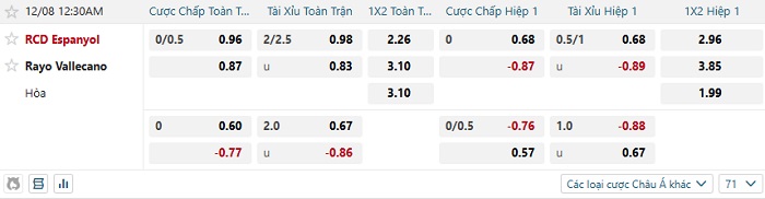 Tip kèo Châu Á hiệp 1 Espanyol vs Vallecano
