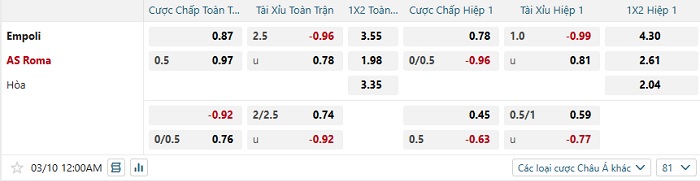 Tip kèo Châu Á hiệp 1 Empoli vs Roma