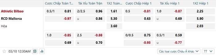 Tip kèo Châu Á hiệp 1 Bilbao vs Mallorca