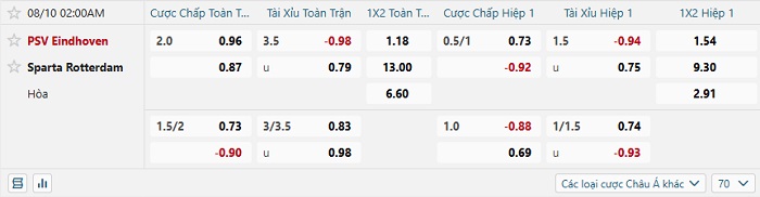 Tip kèo Châu Á hiệp 1 PSV vs Sparta Rotterdam