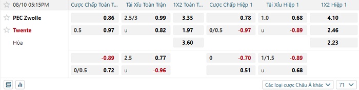 Tip kèo Châu Á full trận PEC Zwolle vs Twente