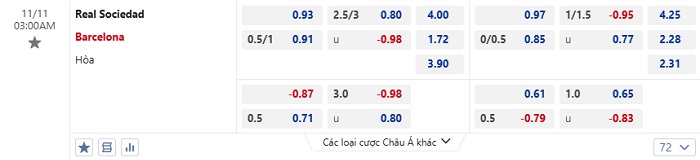 Tip kèo Châu Á full trận Real Sociedad vs Barcelona