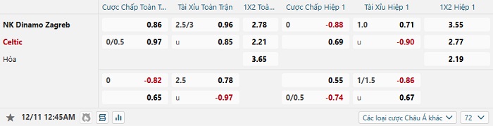 Tip kèo Châu Á hiệp 1 Dinamo Zagreb vs Celtic