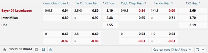 Tip kèo Châu Á hiệp 1 Bayer Leverkusen vs Inter