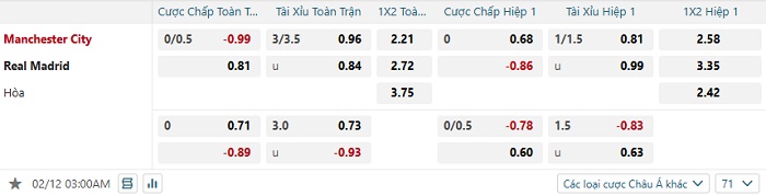Tip kèo Châu Á hiệp 1 Man City vs Real Madrid