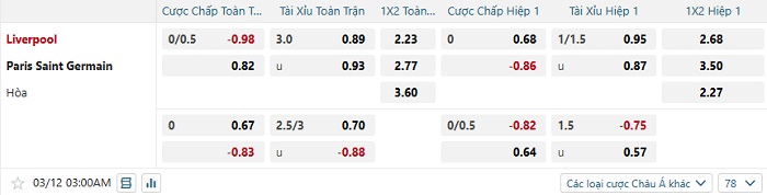 Tip kèo Châu Á hiệp 1 Liverpool vs PSG