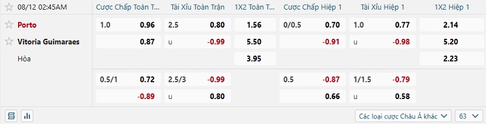 Tip kèo Châu Á hiệp 1 Porto vs Vitoria Guimaraes