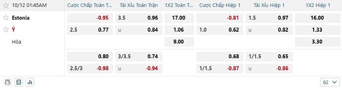 Tip kèo Châu Á full trận Estonia vs Ý