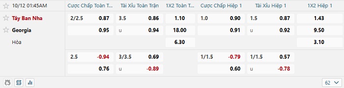 Tip kèo Châu Á hiệp 1 Tây Ban Nha vs Georgia