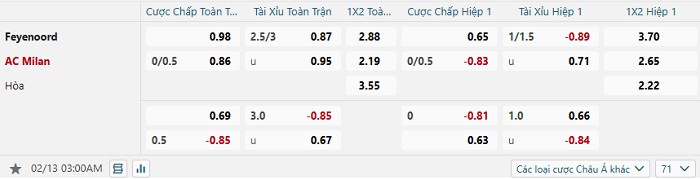 Tip kèo Châu Á full trận Feyenoord vs Milan