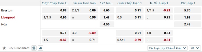 Tip kèo Châu Á hiệp 1 Everton vs Liverpool