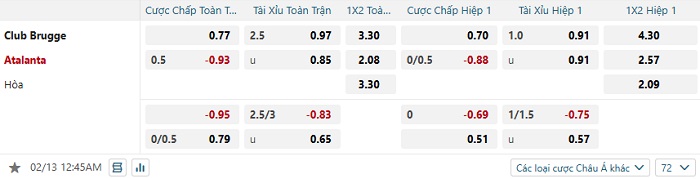 Tip kèo Châu Á hiệp 1 Club Brugge vs Atalanta