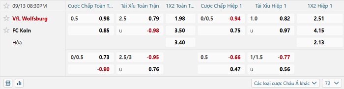 Tip kèo Châu Á hiệp 1 Wolfsburg vs Koln