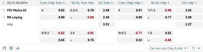 Tip kèo Châu Á hiệp 1 Mainz vs Leipzig