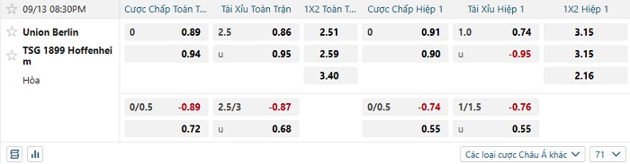 Tip kèo Châu Á hiệp 1 Union Berlin vs Hoffenheim
