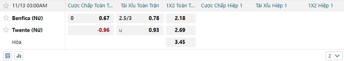 Tip kèo Châu Á hiệp 1 Benfica vs Twente