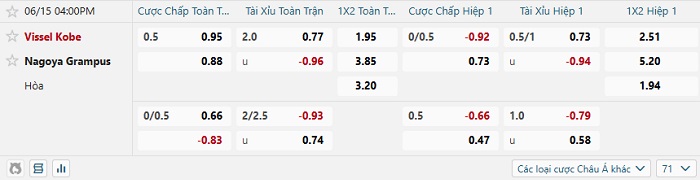 Tip kèo Châu Á hiệp 1 Vissel Kobe vs Nagoya Grampus