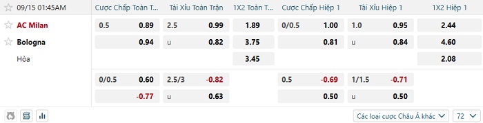Tip kèo Châu Á hiệp 1 Milan vs Bologna