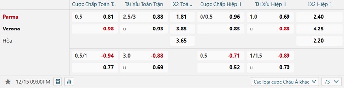 Tip kèo Châu Á hiệp 1 Parma vs Verona