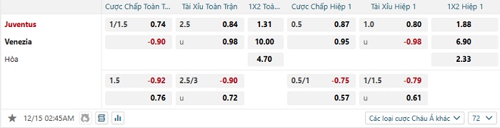 Tip kèo Châu Á full trận Juventus vs Venezia