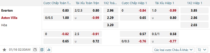 Tip kèo Châu Á hiệp 1 Everton vs Aston Villa