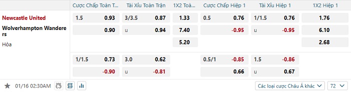 Tip kèo Châu Á hiệp 1 Newcastle vs Wolves