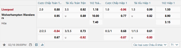 Tip kèo Châu Á full trận Liverpool vs Wolves