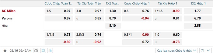 Tip kèo Châu Á full trận Milan vs Verona