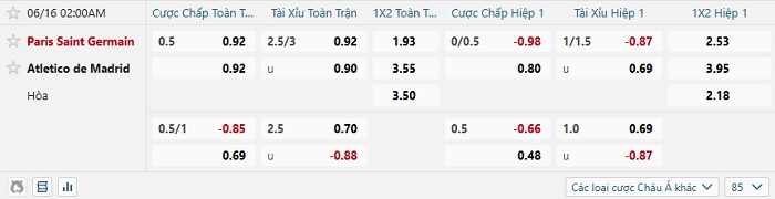 Tip kèo Châu Á full trận PSG vs Atletico Madrid