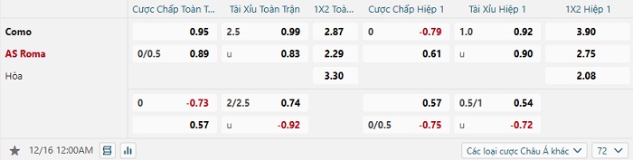 Tip kèo Châu Á full trận Como vs Roma