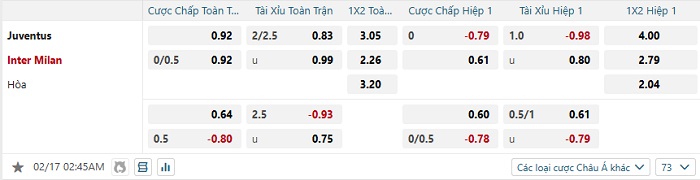 Tip kèo Châu Á full trận Juventus vs Inter Milan