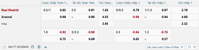 Tip kèo Châu Á hiệp 1 Real Madrid vs Arsenal