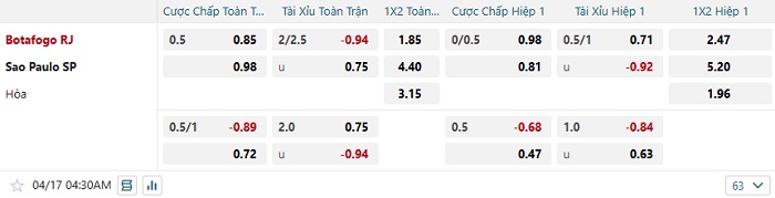 Tip kèo Châu Á hiệp 1 Botafogo vs Sao Paulo