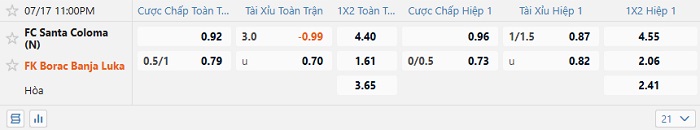 Tip kèo Châu Á hiệp 1 Santa Coloma vs FK Borac Banja