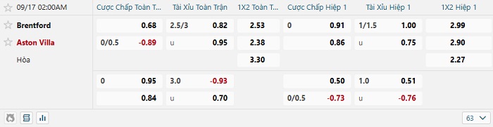 Tip kèo Châu Á hiệp 1 Brentford vs Aston Villa