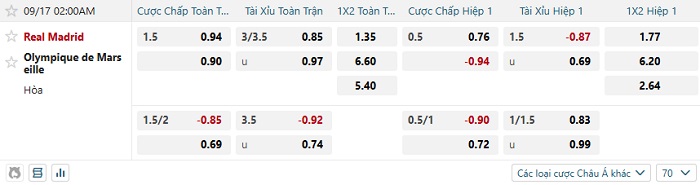 Tip kèo Châu Á full trận Real Madrid vs Marseille